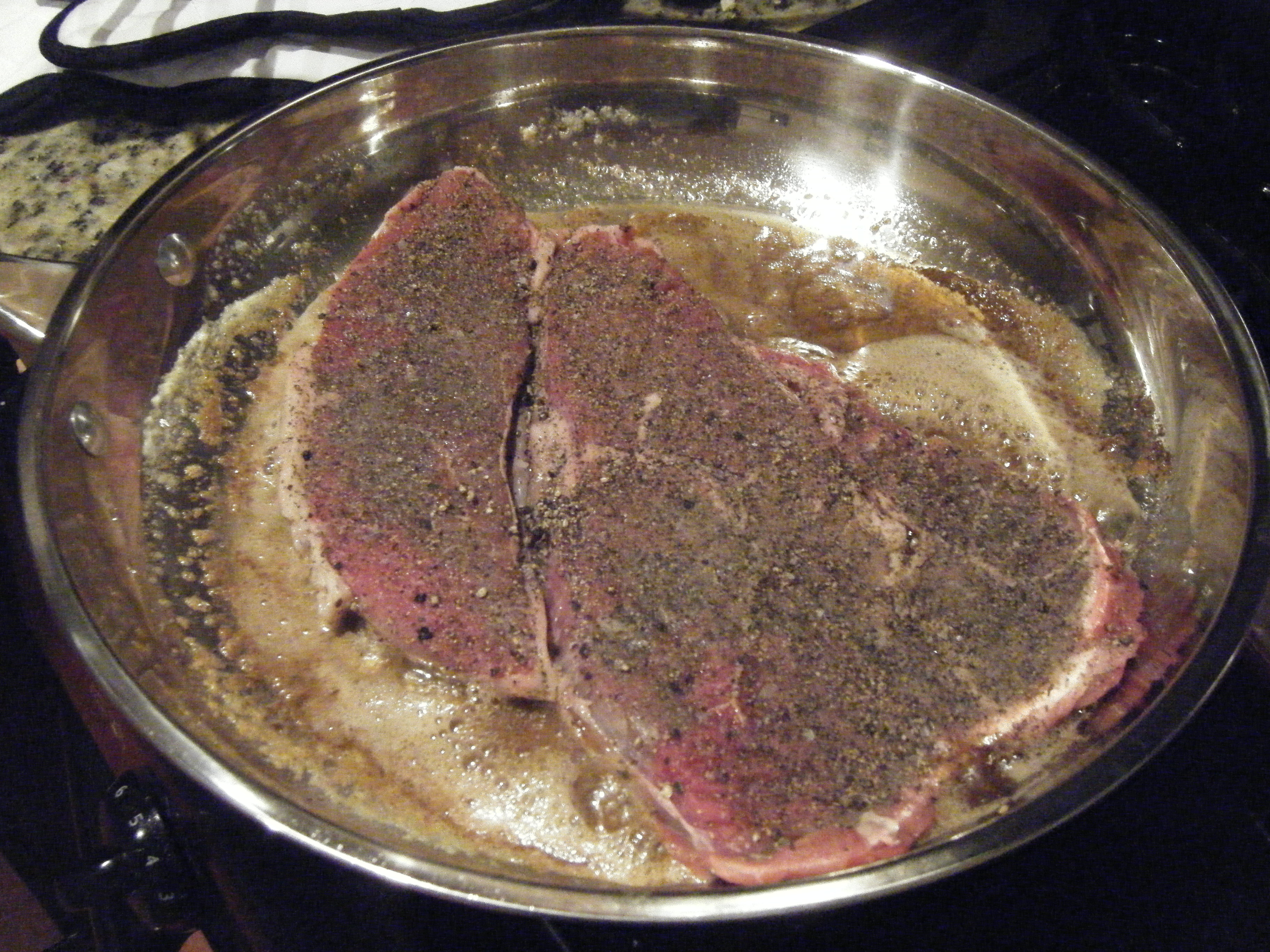 When I think ‘Pepper Steak’ I think the of Chinese dish: beef in brown sauce with lots of   bell pepper chunks. When Dinner is Served! says ‘Pepper Steak’ it means steak that is slathered in crushed black pepper and then cooked in butter.