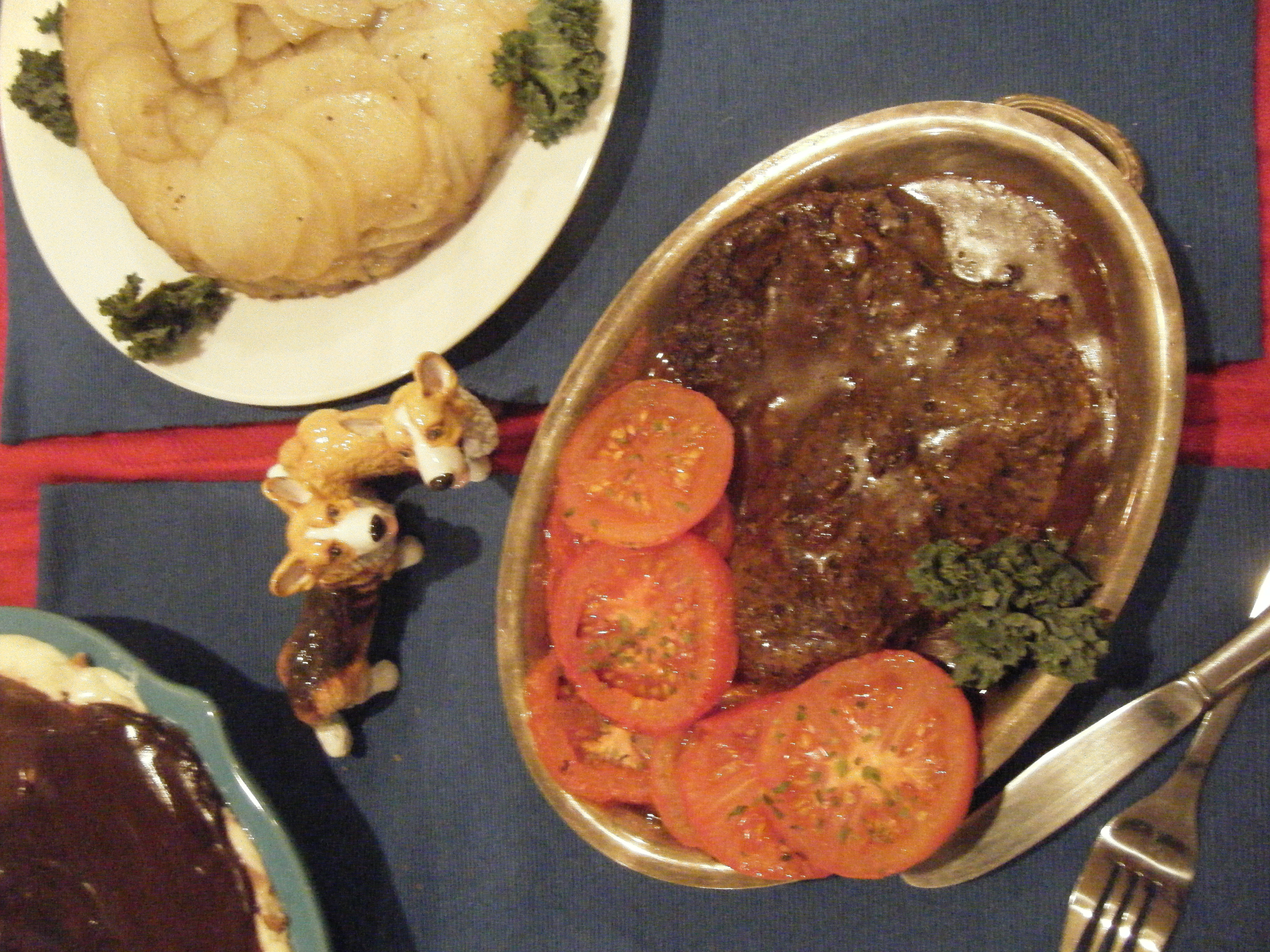 Here is the finished dinner, complete with little corgi-shaped salt and pepper holders.