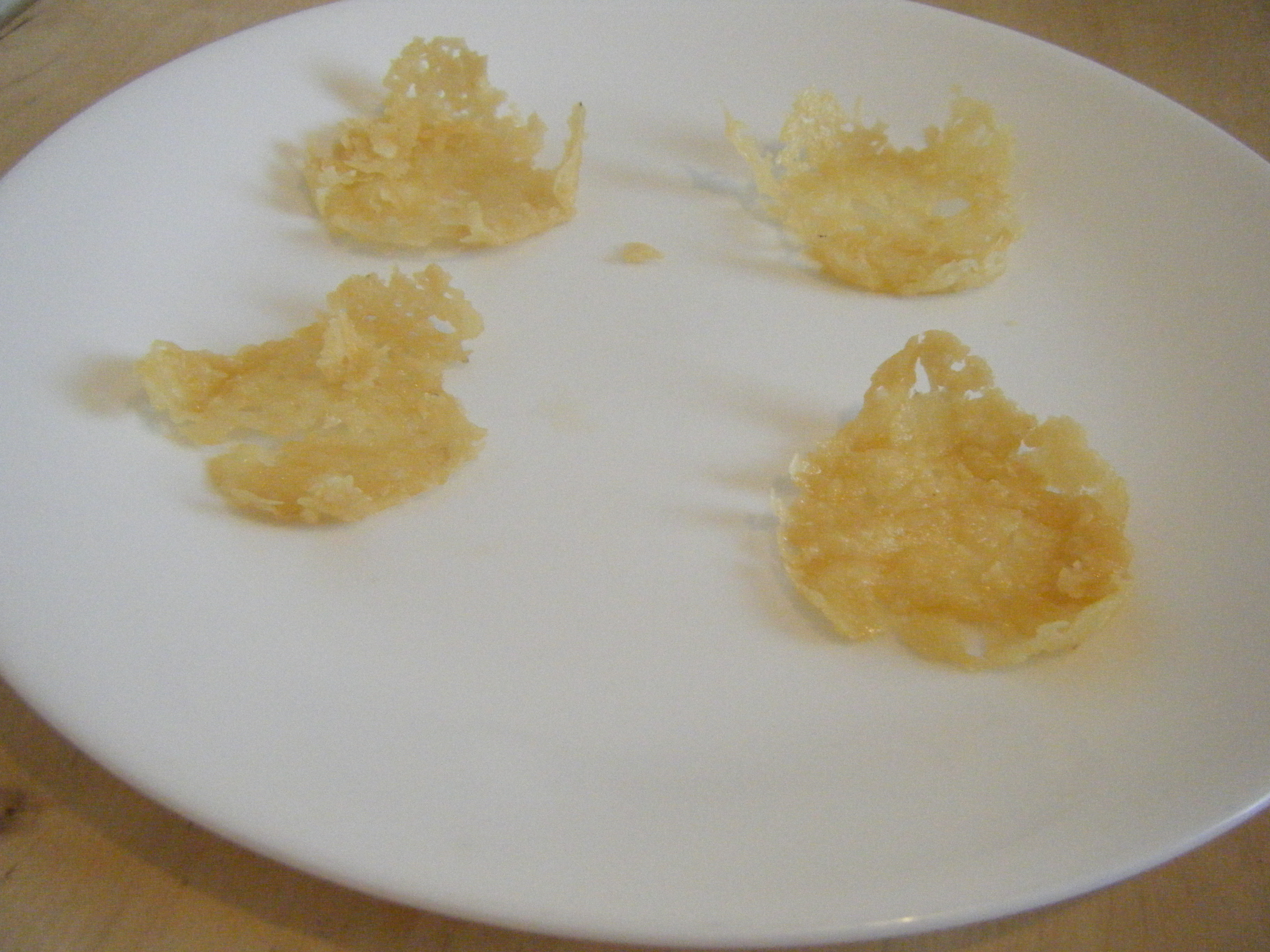 To get the shredded Parmesan into patties that would come off of the parchment paper took MUCH longer than indicated. The recipe’s three and a half minutes turned into about 9 minutes. And even then I think they would have benefited by a wee bit more heat.