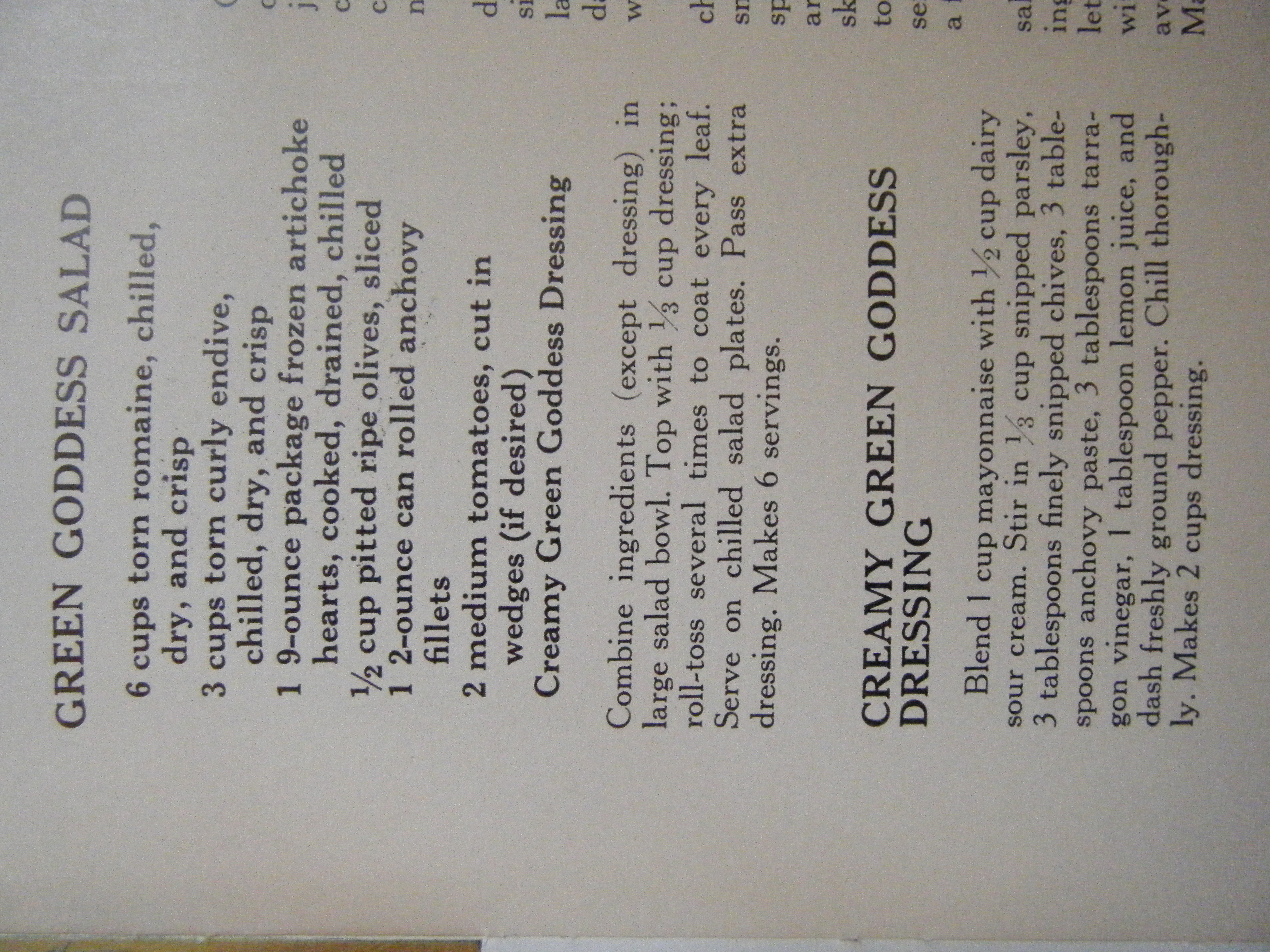 For the tossed green salad I decided to go with a Green Goddess dressing. I found this recipe in The Better Homes & Gardens Vegetable Cook Book (1967 edition).