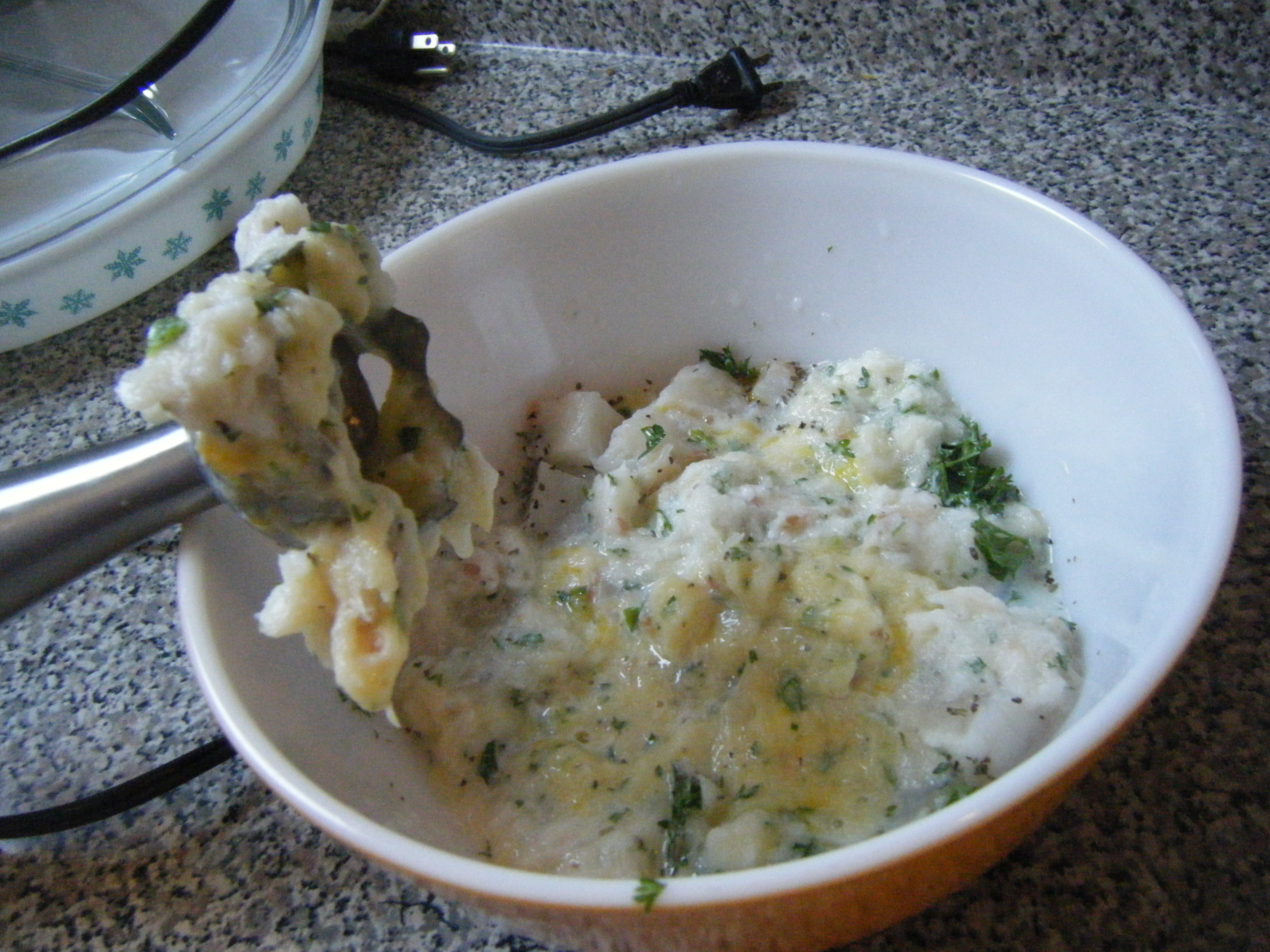 I do not own a food processor so I used my handy-dandy immersion blender. It got the job done. Here is the fish ball mix–from mush, to paste, to fully cooked balls in the cream sauce with the shrimp (so scallops because they were too damn pricey):