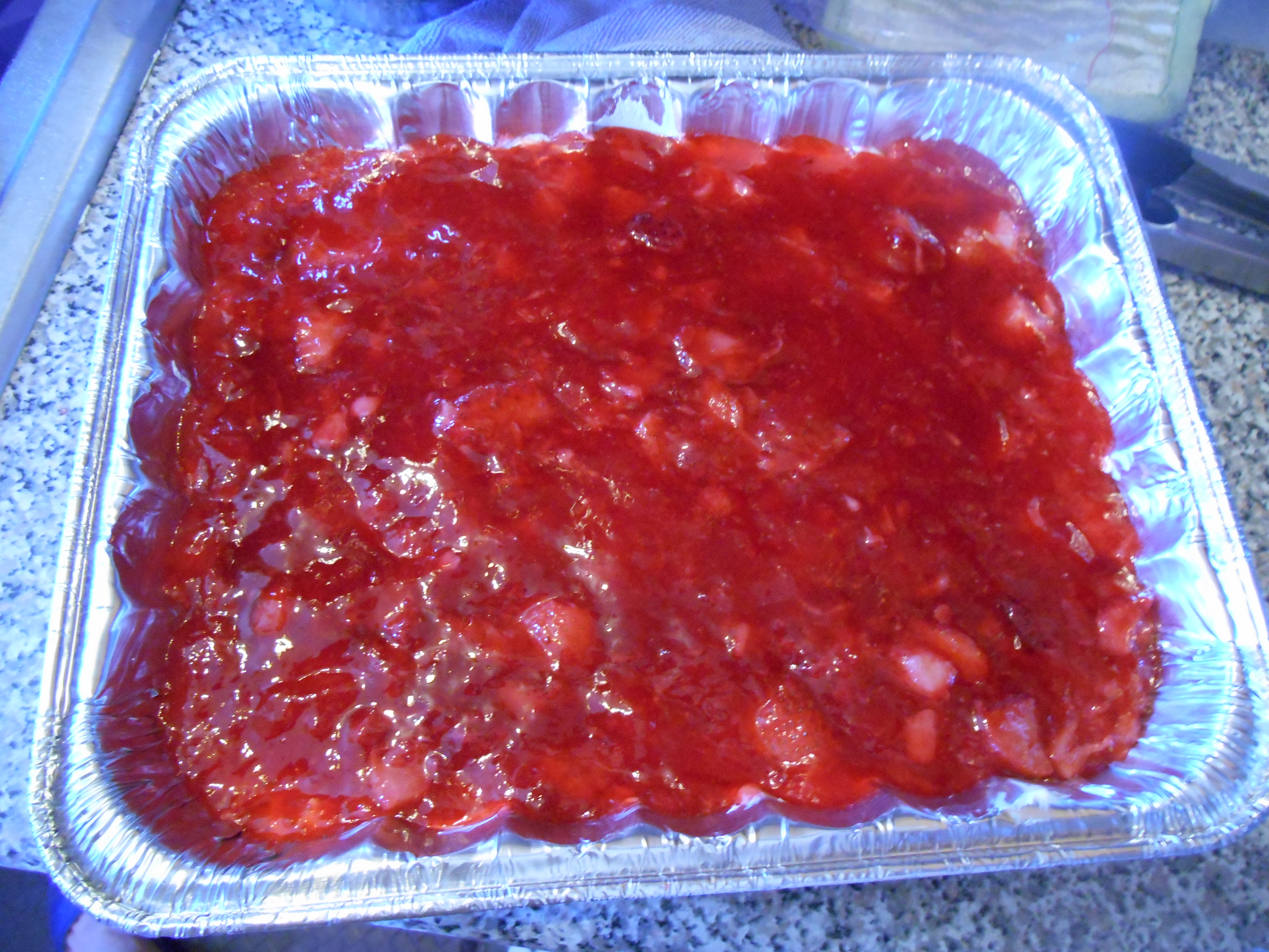 - Dissolve Jell-O in two cups boiling water. Stir in fruit. Let Jell-O stand for ten minutes until starting to thicken. Spread over cheese and chill. (note: I let the strawberries thaw a little bit before mixing them with the Jell-O.
